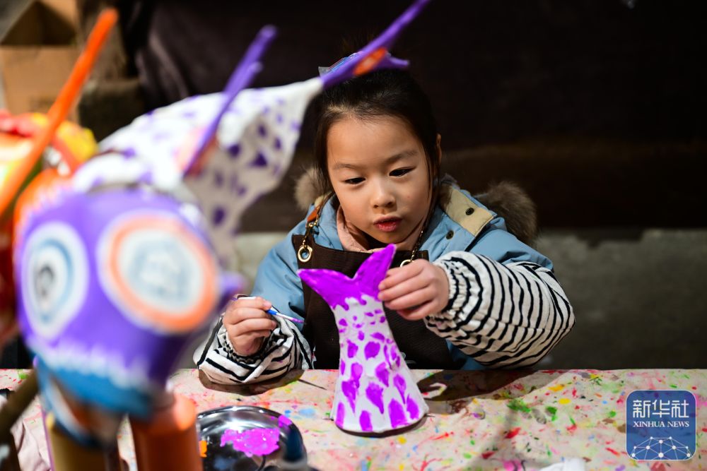 2月8日,小朋友在瞻淇村里體驗(yàn)魚(yú)燈制作。