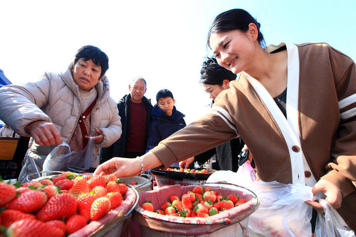 在江蘇邳州邢樓鎮(zhèn)的邢樓大集上,顧客在選購(gòu)本地草莓(2月14日攝)。蒯創(chuàng)攝