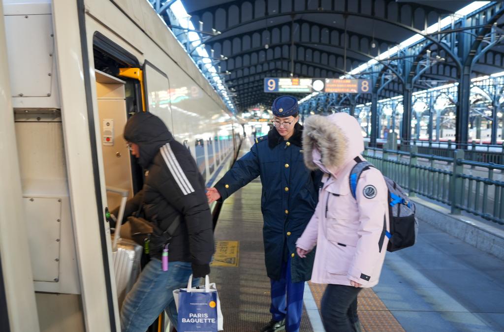 中國鐵路哈爾濱局集團有限公司工作人員(中)在哈爾濱火車站為旅客服務。李昕洋 攝