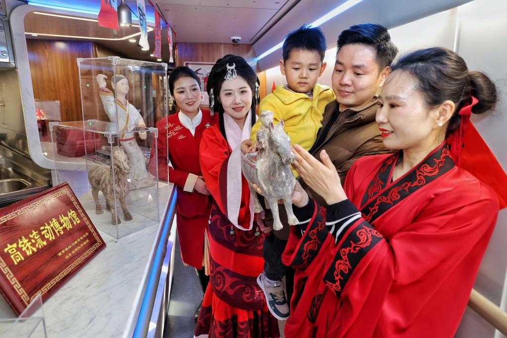 2月11日,南方小年。由西安北發(fā)車的G916次列車,車廂內(nèi)被打造成沉浸式漢代文化體驗空間,以漢代馬形文物為靈感的主題車窗貼熠熠生輝,馬蹄酥等特色美食飄香四溢,馬年元素貫穿全程。