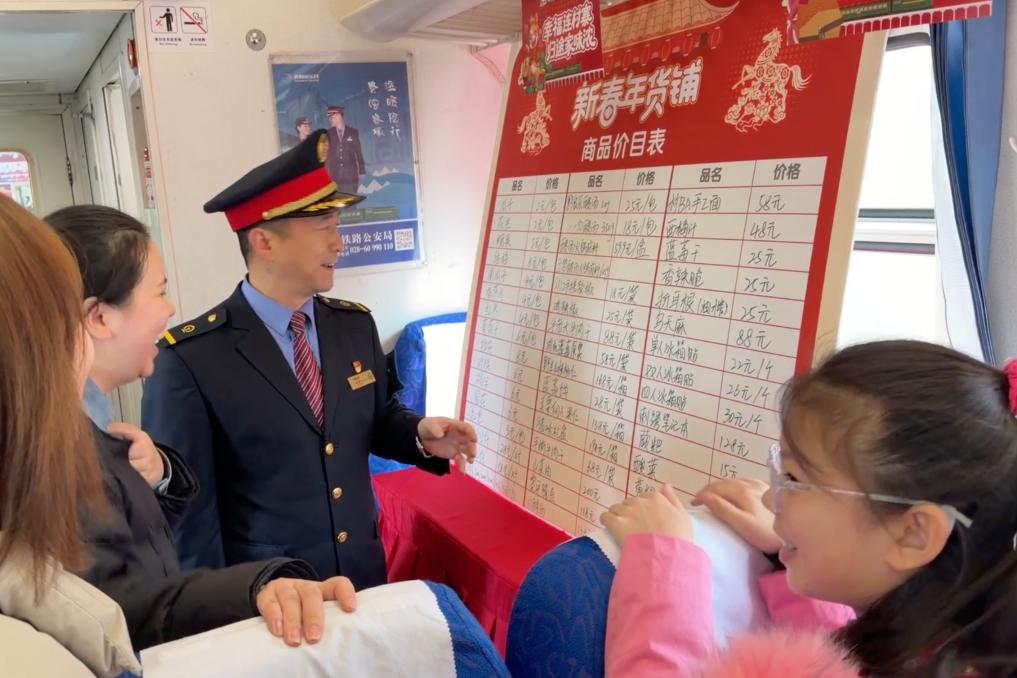 5640次列車列車長胡貴川向旅客介紹年貨價格。(國鐵成都局集團公司貴陽客運段供圖)