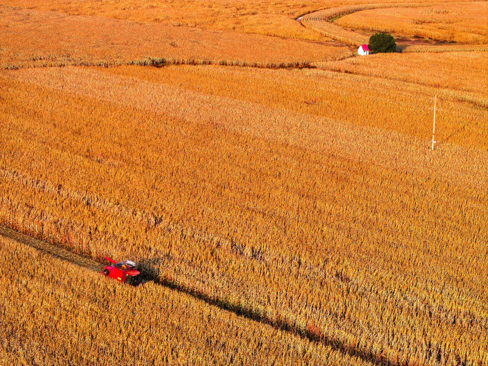 農(nóng)機(jī)手駕駛收割機(jī)在內(nèi)蒙古自治區(qū)通遼市科爾沁區(qū)豐田鎮(zhèn)收割玉米(2025年10月14日攝,無人機(jī)照片)?!笆奈濉睍r(shí)期,糧食總產(chǎn)量由2021年的1.37萬億斤增至2025年的1.43萬億斤,連續(xù)兩年站穩(wěn)在1.4萬億斤的臺(tái)階。