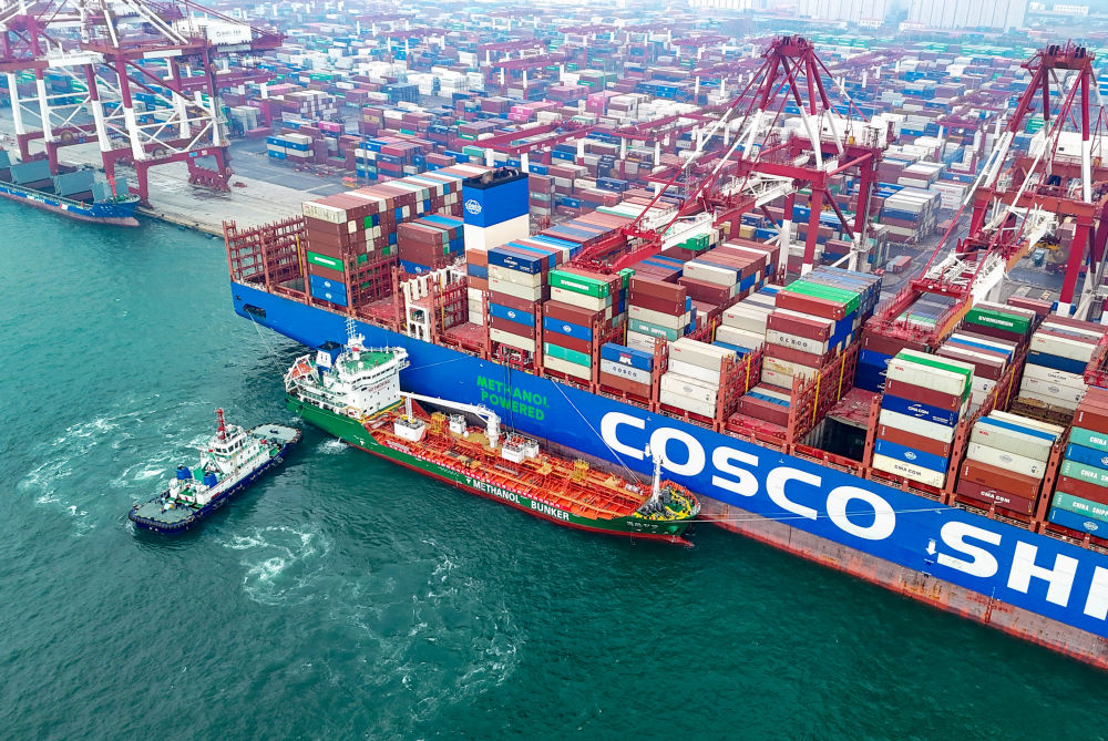 3月2日,在山東港口青島港,甲醇加注船“建航利達(dá)”輪為一艘貨輪進(jìn)行綠色甲醇“船對(duì)船”加注作業(yè)(無(wú)人機(jī)照片)。新華社發(fā)(張進(jìn)剛攝)