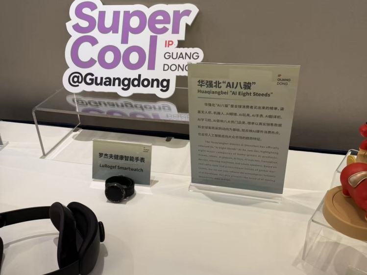 在廣東代表團開放團組活動會場外的走廊里,當?shù)囟嗉移髽I(yè)展示廣東特色美食,以及眾多深受全球消費者喜愛的智能產(chǎn)品。其中就有被譽為“華強北AI八駿"的AI產(chǎn)品,這是由全球消費者實打?qū)崱百I出來”的榜單好物,涵蓋無人機、機器人、AI眼鏡、AI學習機與音響等,此外還有人形機器人手辦、AI吉他、AI娃娃等最新科技產(chǎn)品,以眼見為實的產(chǎn)品展現(xiàn)廣東經(jīng)濟發(fā)展蓬勃活力,吸引大批外國記者拍照、采訪與試用。