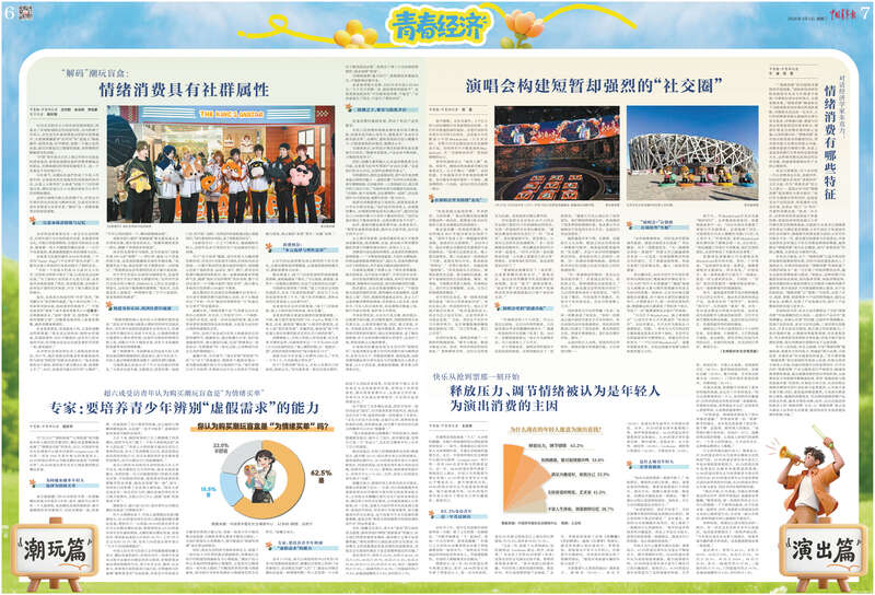 消費端彰顯“青春經(jīng)濟(jì)”活力。青年消費者追求的不再是單一產(chǎn)品,而是更加注重情感共鳴、文化認(rèn)同和價值表達(dá),由“性價比”轉(zhuǎn)向“心價比”。中青報及中青校媒記者調(diào)研發(fā)現(xiàn),61.2%的受訪青年會為了釋放壓力、調(diào)節(jié)情緒而為演出花錢,62.5%的受訪青年認(rèn)為購買潮玩盲盒是在為情緒買單。國研新經(jīng)濟(jì)研究院創(chuàng)始院長朱克力認(rèn)為,年輕一代的消費正變得越來越多元化、個性化,充滿文化感、設(shè)計感和科技感。“這些特性與社會躍遷密切相關(guān)?!?/p>