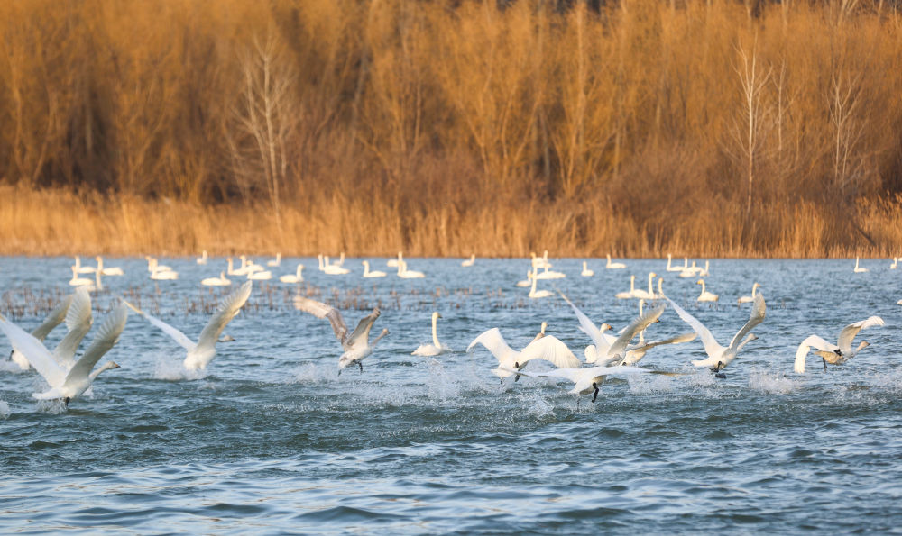 每年11月下旬至次年3月,大天鵝都會到位于黃河中游的三門峽黃河濕地越冬。據(jù)三門峽黃河天鵝湖濕地保護中心統(tǒng)計,天鵝數(shù)量從20世紀90年代的幾十只,增至如今的1.6萬余只。