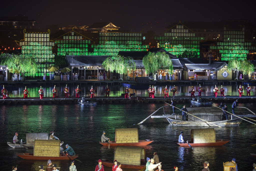 《大宋·東京夢(mèng)華》更是夢(mèng)幻場(chǎng)景。700多名演員,以八首經(jīng)典宋詞為軸,在真實(shí)的亭臺(tái)樓閣與汴河水系間,展開70分鐘的視聽奇觀。