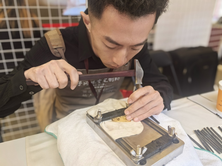 回到現(xiàn)場,95后工匠郭珺文正在演示鏨刻——這是打金中最顯手藝的環(huán)節(jié)。鏨刻臺上,金器被固定,他手持小榔頭敲擊鏨刻刀,“叮叮當(dāng)當(dāng)”一點一點敲出紋樣?!耙话阋?jīng)過幾萬次,才能達(dá)到預(yù)期效果。”他說。攤位前,幾位上海阿姨湊近仔細(xì)圍觀,問道:“蠻靈,黃金有損耗伐?”