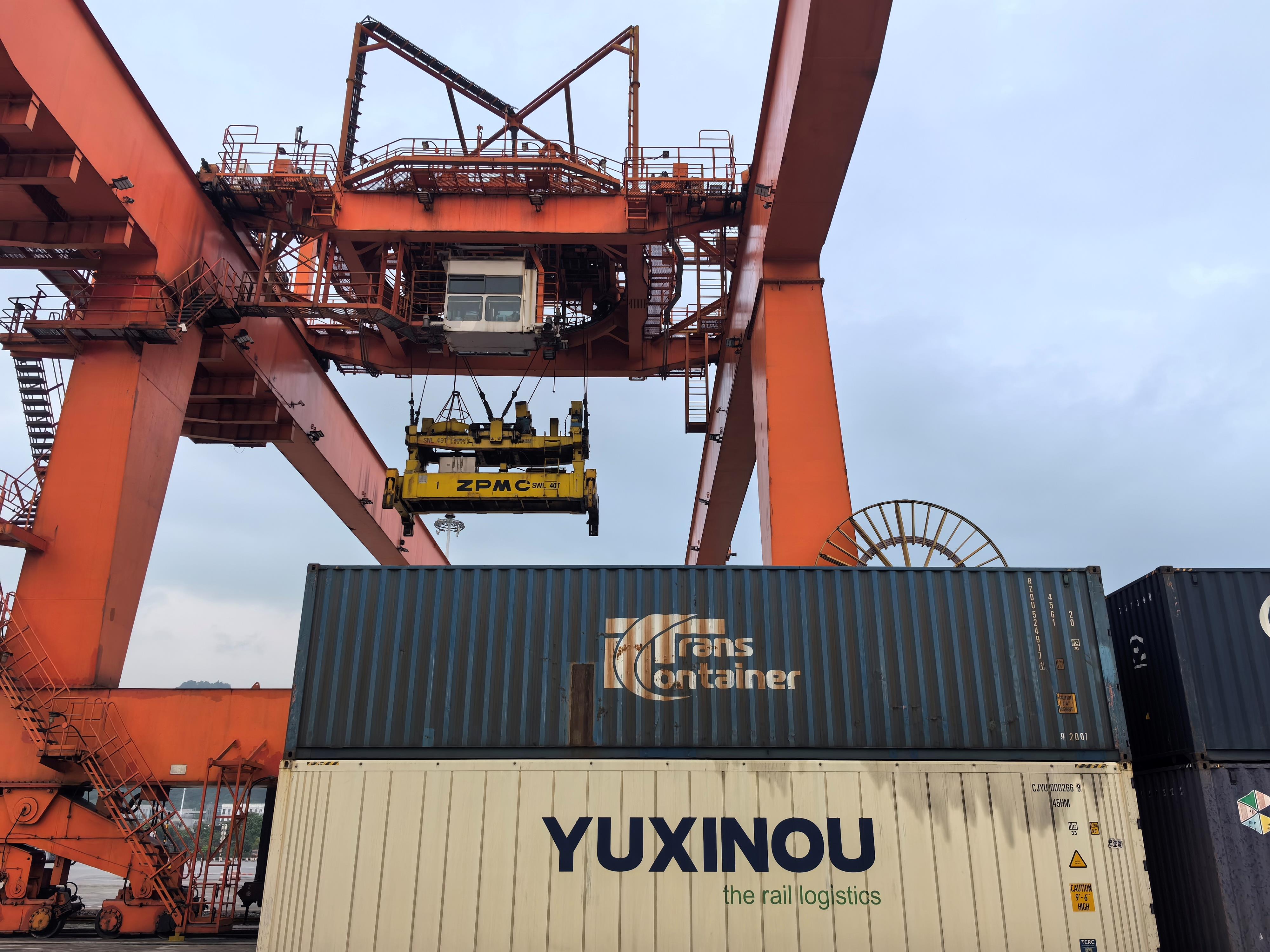 重慶國際物流樞紐園區(qū)內(nèi),中歐班列運送的“渝新歐”集裝箱整齊排列。(總臺央廣記者潘毅拍攝)