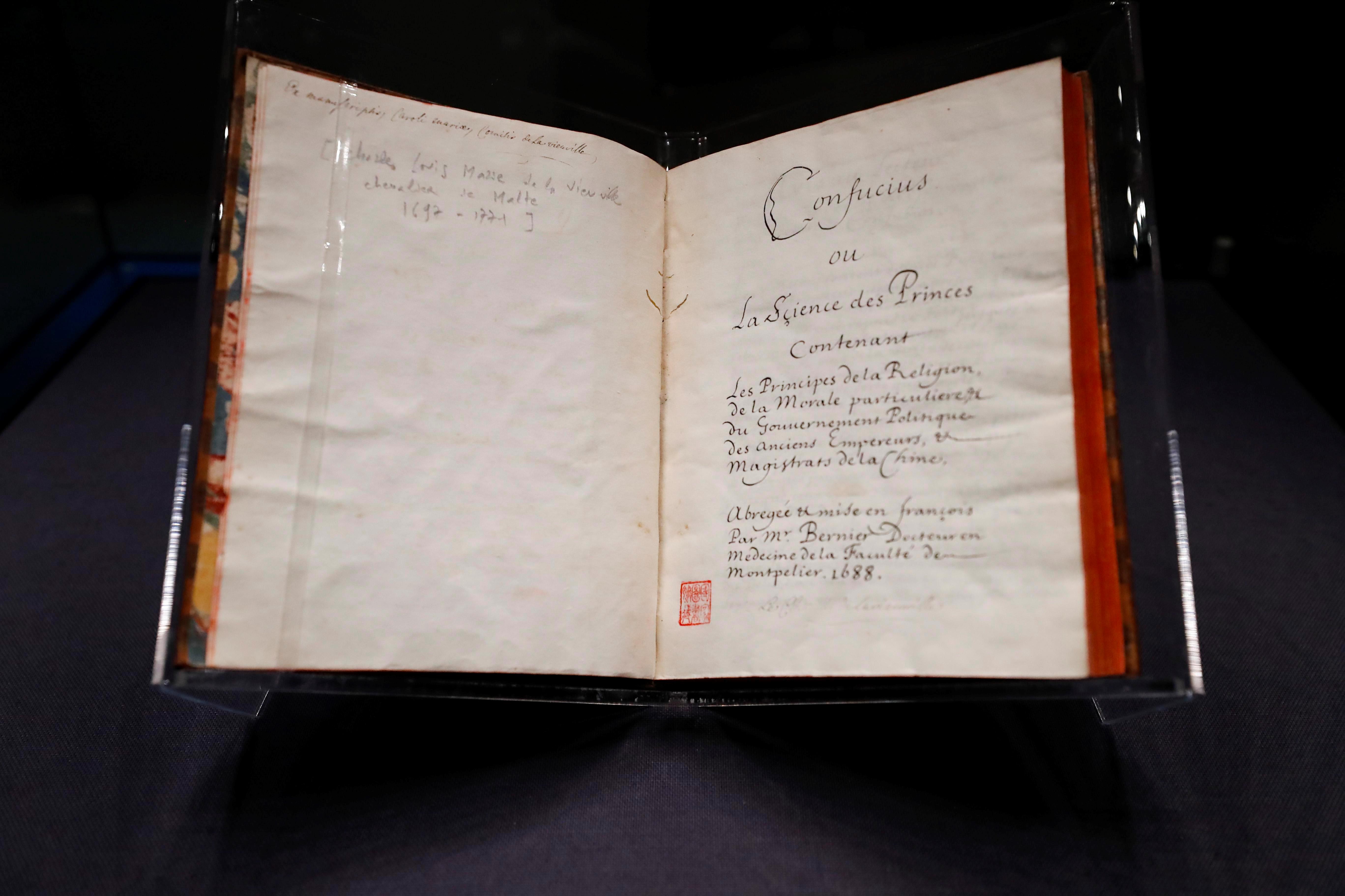 1688年,首部《論語(yǔ)導(dǎo)讀》法文版原著正式出版。牛皮封面、飄口燙金、染紋紙環(huán)襯、書口刷紅……這是一本富有法國(guó)啟蒙時(shí)期書籍裝幀特征的古老典籍,世界上僅存兩本。