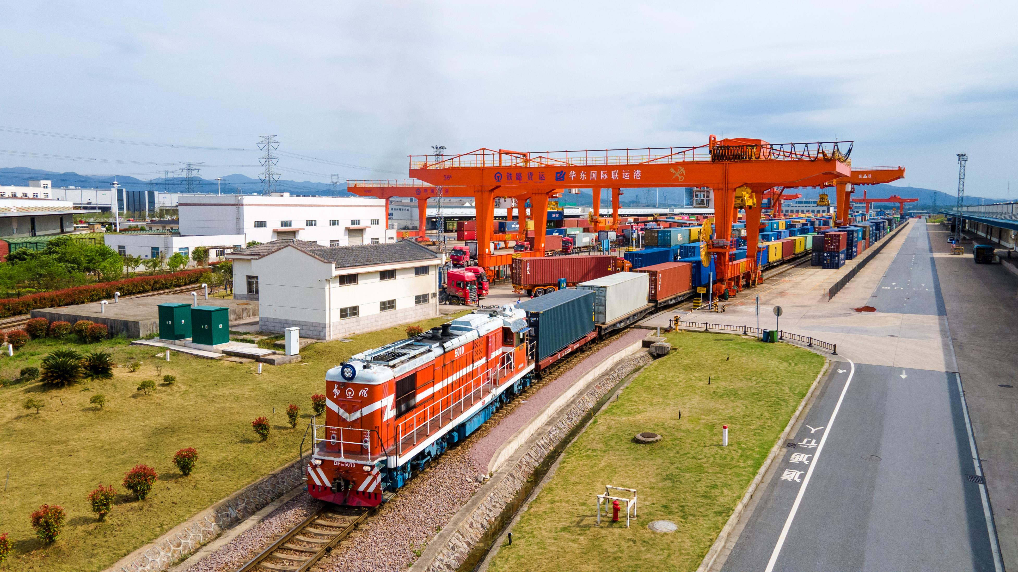 △2024年4月1日,浙江省金華華東國(guó)際聯(lián)運(yùn)港,一列中歐班列裝載110個(gè)標(biāo)箱日用百貨、電動(dòng)工具、機(jī)械裝備等貨物從鐵路金華南貨場(chǎng)啟程駛往匈牙利布達(dá)佩斯。