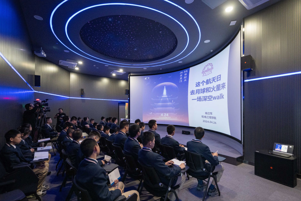 學(xué)生在哈爾濱工業(yè)大學(xué)航天館內(nèi)聽(tīng)中國(guó)航天日主題講座(2024年4月24日攝)。新華社記者 謝劍飛 攝