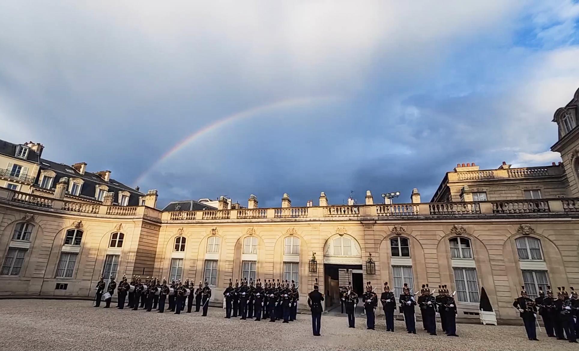 當(dāng)?shù)貢r(shí)間5月6日晚,習(xí)近平主席在巴黎出席馬克龍總統(tǒng)舉行的盛大歡迎宴會(huì)。宴會(huì)前,愛(ài)麗舍宮上空出現(xiàn)彩虹。彩虹連接著東西方。塞納河畔,正寫(xiě)下中法兩國(guó)“雙向奔赴”的新故事。