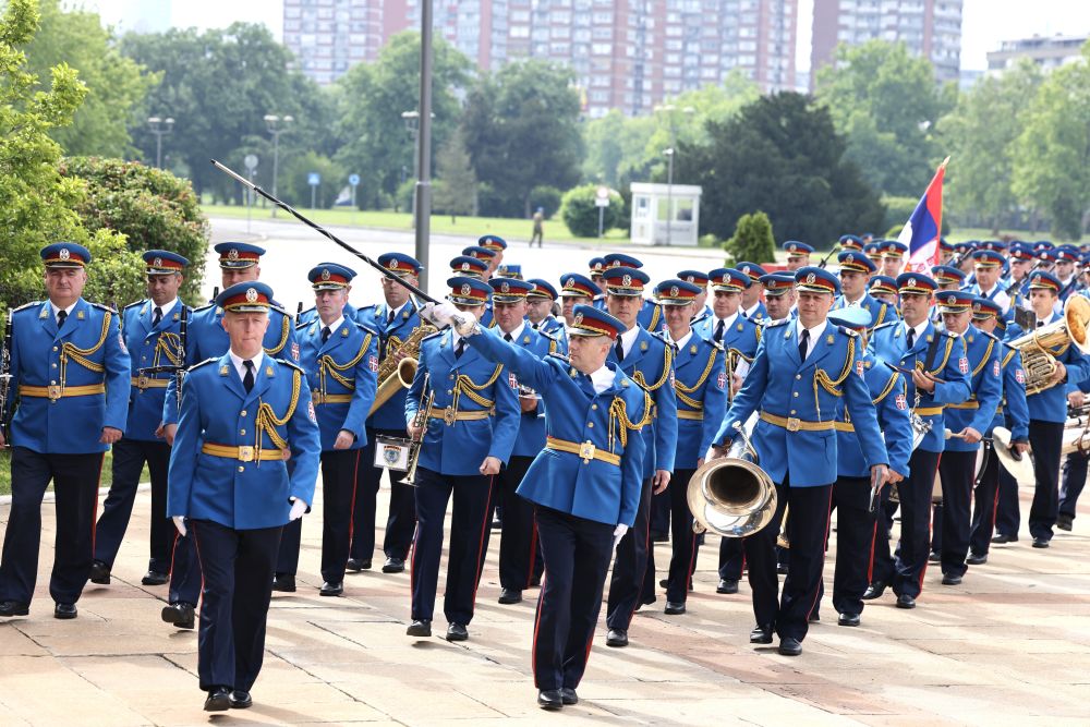 塞爾維亞大廈前,中塞兩國國旗迎風飄揚,儀仗隊威武雄壯。