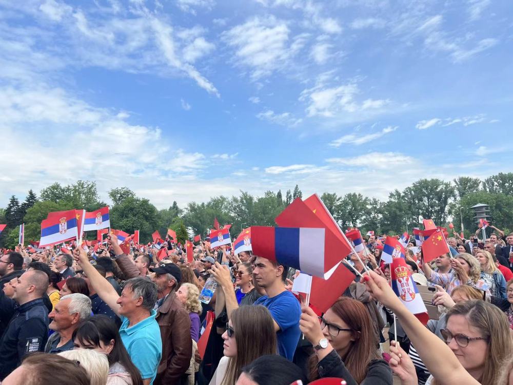 大廈廣場上,一萬五千名塞爾維亞民眾揮舞中塞兩國國旗,對習(xí)近平表示最熱烈的歡迎。