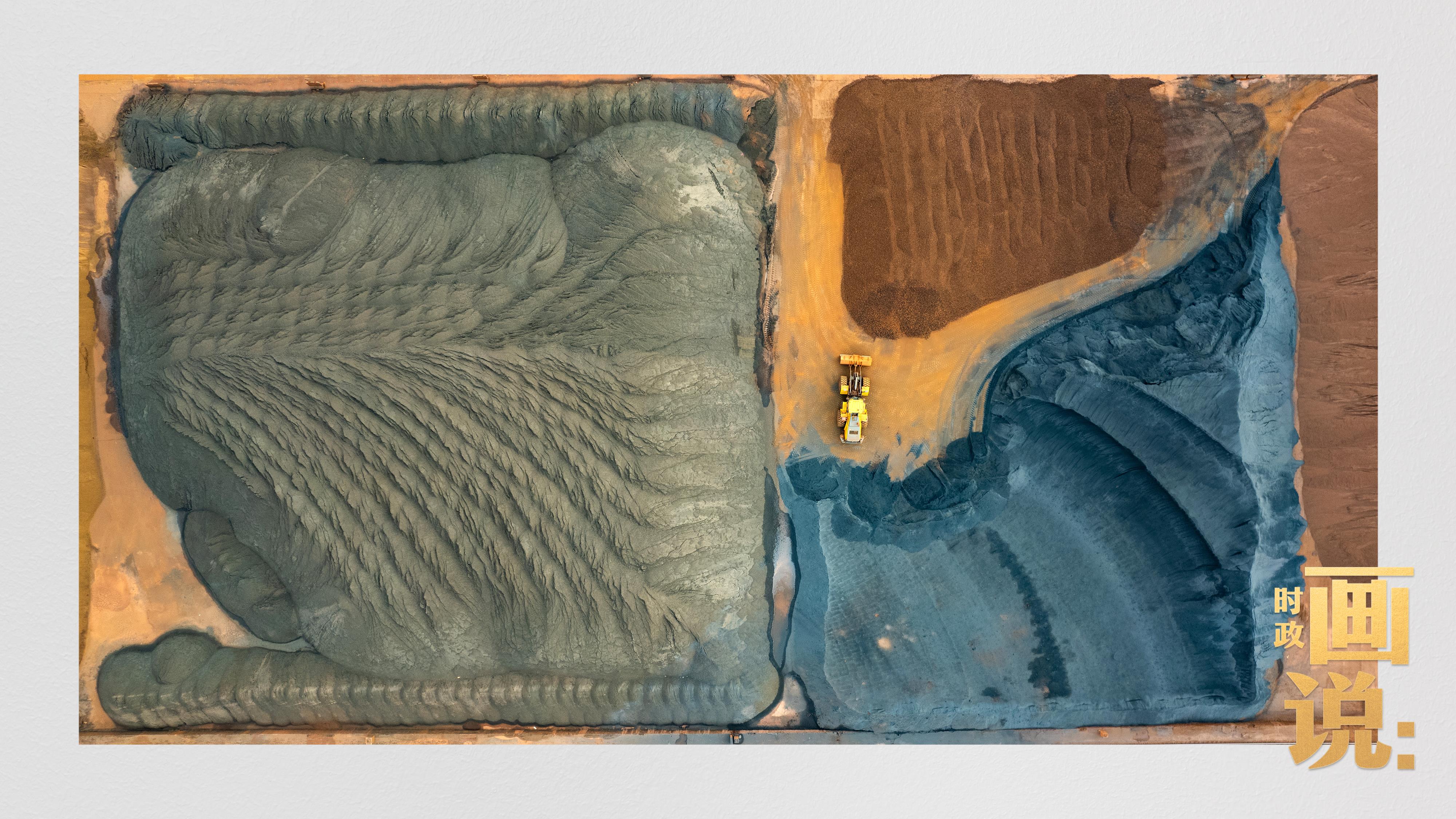 △港區(qū)內(nèi)的礦石堆場(chǎng)整理堆放著五顏六色的各類礦石、礦砂,宛如油畫。
