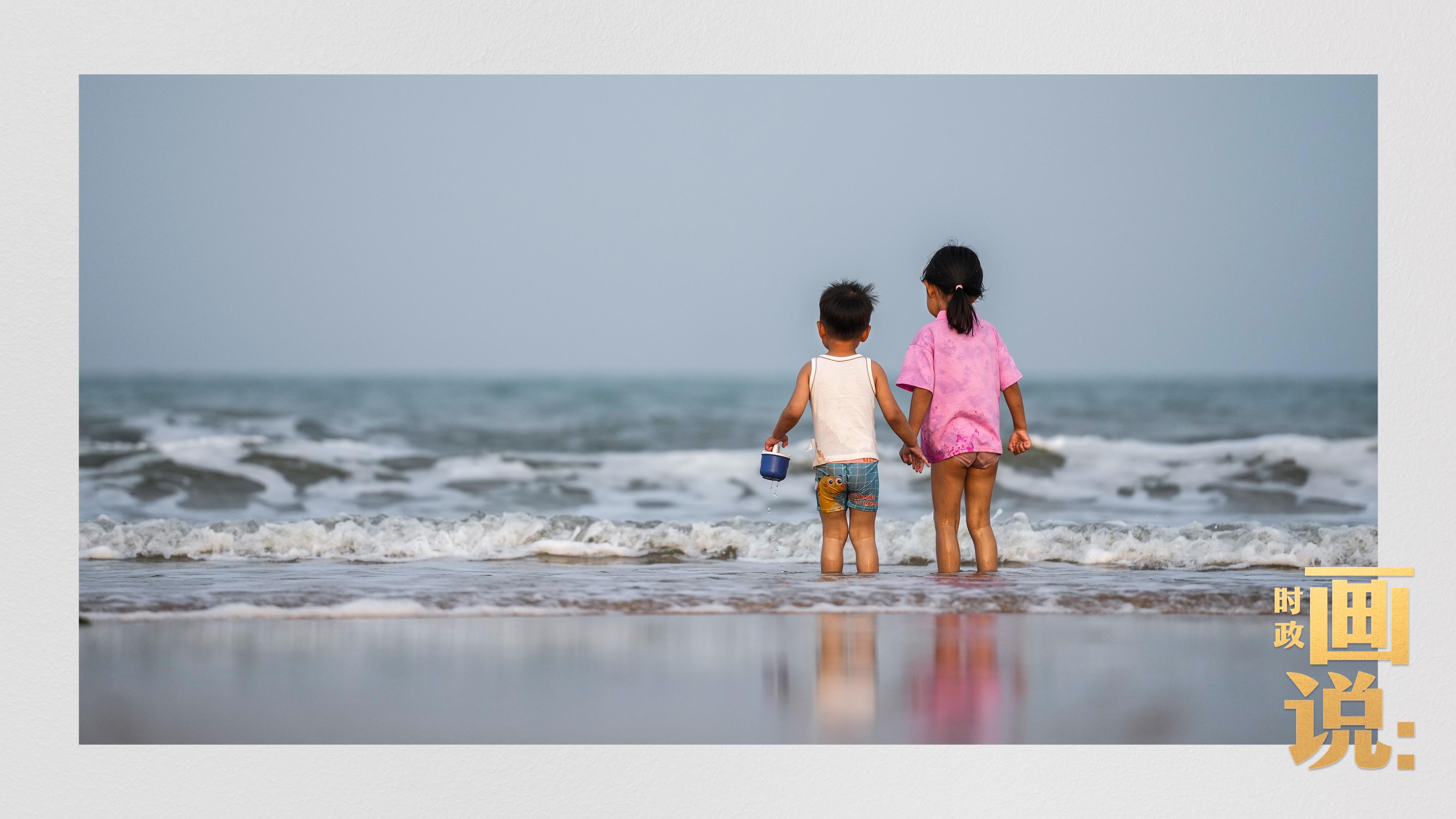 △日照陽光海岸綠道上的萬平口景區(qū),一對(duì)游客在海浪中翩然起舞。