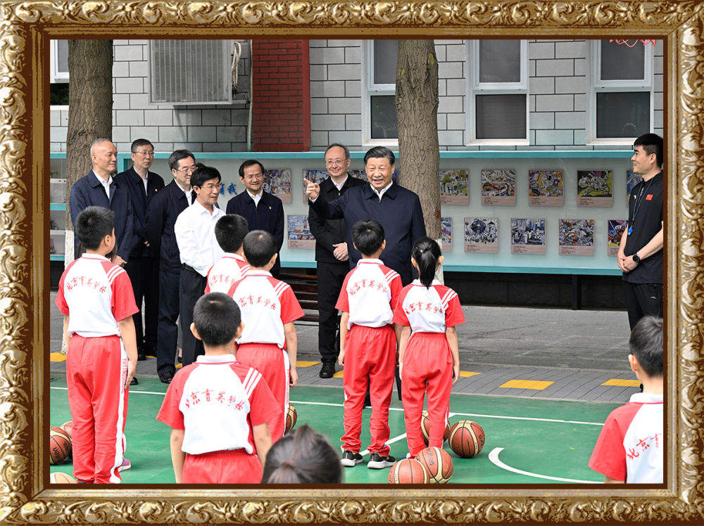 2023年5月31日上午,習近平總書記來到北京育英學??赐繂枎熒?,在籃球場同正在上體育課的小學生們親切交流。習近平親切地說:“現(xiàn)在生活條件好了,孩子們不是要吃得胖胖的,而是要長得壯壯的、練得棒棒的。”