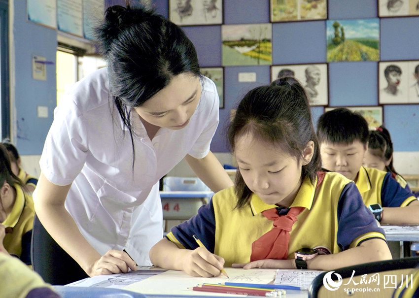 5月31日,南充市嘉陵區(qū)之江小學,學生在老師指導下學習繪畫。人民網(wǎng) 趙祖樂攝