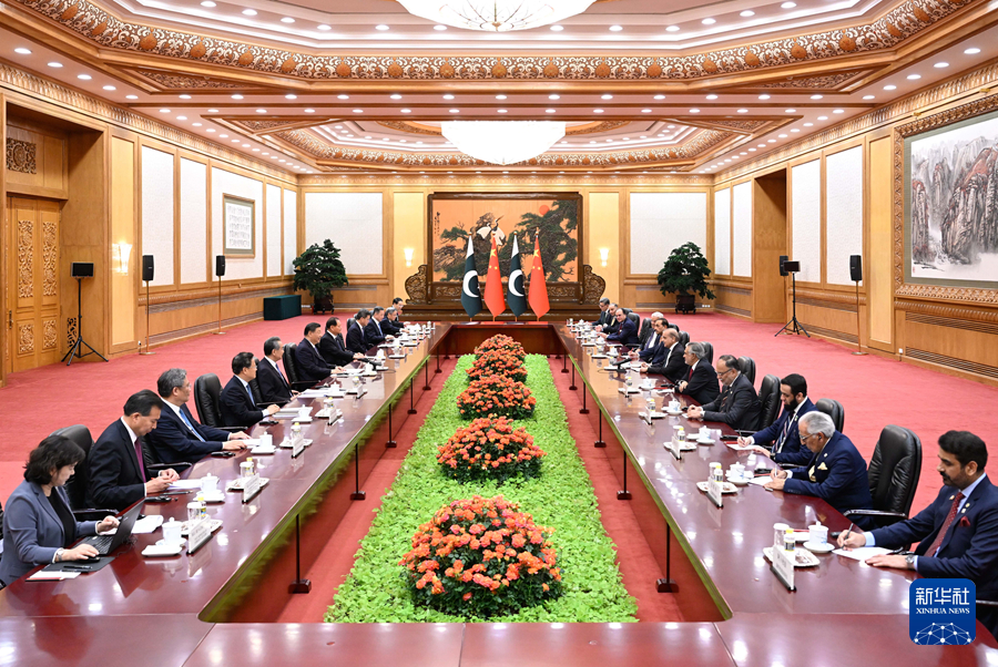 6月7日下午,國(guó)家主席習(xí)近平在北京人民大會(huì)堂會(huì)見來華正式訪問的巴基斯坦總理夏巴茲。新華社記者 黃敬文 攝