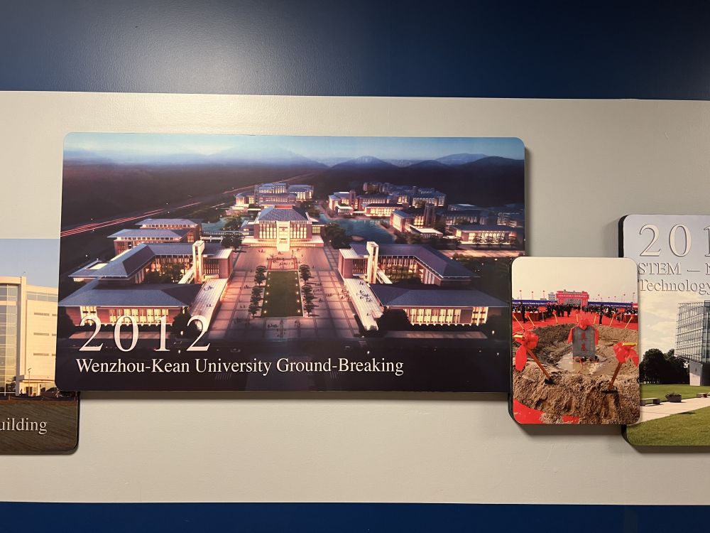 在美國肯恩大學主校區(qū)學生中心走廊內(nèi)懸掛的溫州肯恩大學奠基儀式的照片。