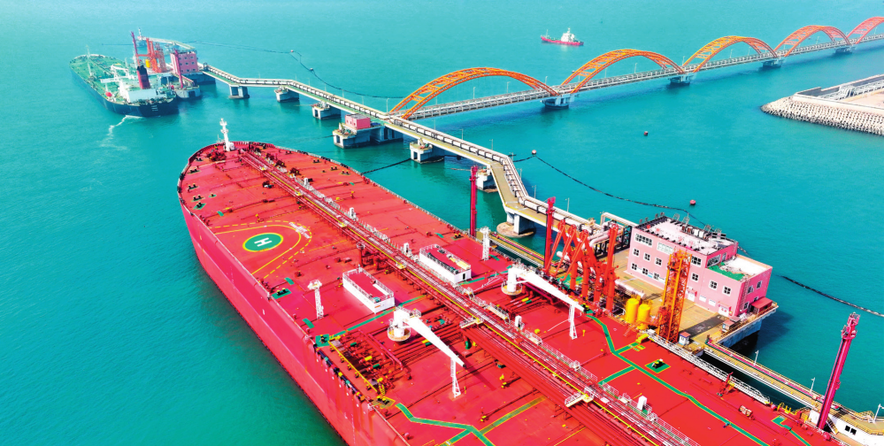 在山東港口日照港嵐山港區(qū)30 萬噸級油品碼頭,船舶??窟M(jìn)行卸油作業(yè)(2024年3月29日攝)郭緒雷攝 / 本刊