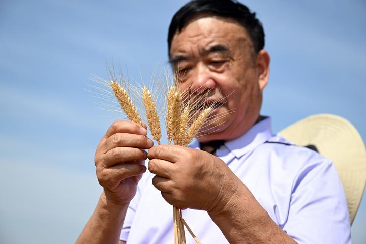 2024年5月29日,在太和縣淙祥現(xiàn)代農(nóng)業(yè)種植專(zhuān)業(yè)合作社,徐淙祥(中)和農(nóng)技專(zhuān)家一起為試驗(yàn)麥種測(cè)產(chǎn)。