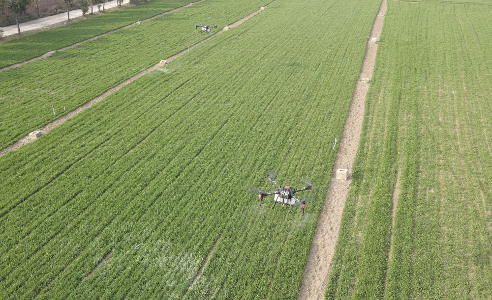 2023年2月21日,在太和縣淙祥現(xiàn)代農(nóng)業(yè)種植專(zhuān)業(yè)合作社,無(wú)人機(jī)噴灑農(nóng)藥(無(wú)人機(jī)照片)。