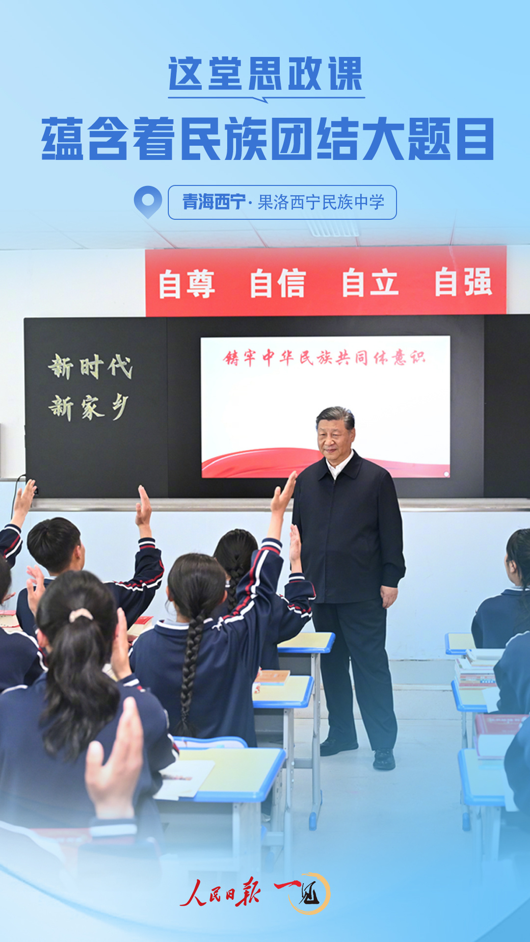 西寧城北,元朔山麓,藍(lán)天白云掩映下的果洛西寧民族中學(xué)綠意蔥蘢。6月18日,正在青海省西寧市考察的習(xí)近平總書(shū)記來(lái)到這里并觀摩了一堂思政課??倳?shū)記對(duì)思政課歷來(lái)很重視——這是落實(shí)立德樹(shù)人根本任務(wù)的關(guān)鍵課程,是培養(yǎng)社會(huì)主義建設(shè)者和接班人的重要保障。
