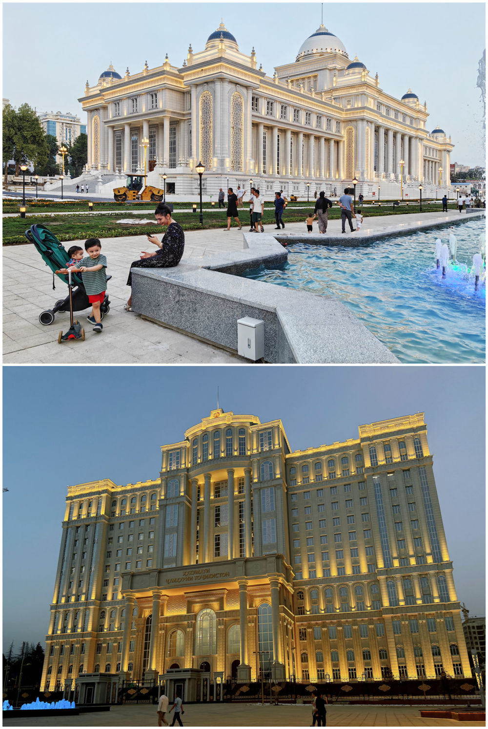塔議會大樓、政府大樓坐落于杜尚別著名的魯達(dá)基大道,相隔數(shù)百米。議會大樓同總統(tǒng)府相望,政府大樓則俯瞰杜尚別另一條交通干道——索莫尼大道。兩座大樓融合歐亞古典柱廊結(jié)構(gòu)、塔吉克民族特色雕刻、伊斯蘭文化風(fēng)格的設(shè)計,外觀大氣、典雅莊重,同魯達(dá)基大道兩側(cè)的古樹、鮮花、噴泉相映成景。