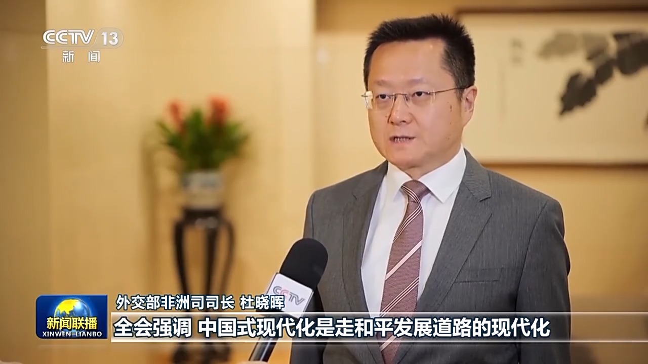 外交部非洲司司長 杜曉暉:全會強(qiáng)調(diào),中國式現(xiàn)代化是走和平發(fā)展道路的現(xiàn)代化,開放是中國式現(xiàn)代化的鮮明標(biāo)識。在百年變局加速演進(jìn)、世界進(jìn)入新的動蕩變革期的大背景下,三中全會給世界注入和平力量、穩(wěn)定力量、進(jìn)步力量、發(fā)展力量。我們將以習(xí)近平外交思想為指引,堅(jiān)定奉行獨(dú)立自主的和平外交政策,推動構(gòu)建人類命運(yùn)共同體,為以中國式現(xiàn)代化全面推進(jìn)強(qiáng)國建設(shè)、民族復(fù)興偉業(yè)營造更有利國際環(huán)境、提供更堅(jiān)實(shí)戰(zhàn)略支撐。