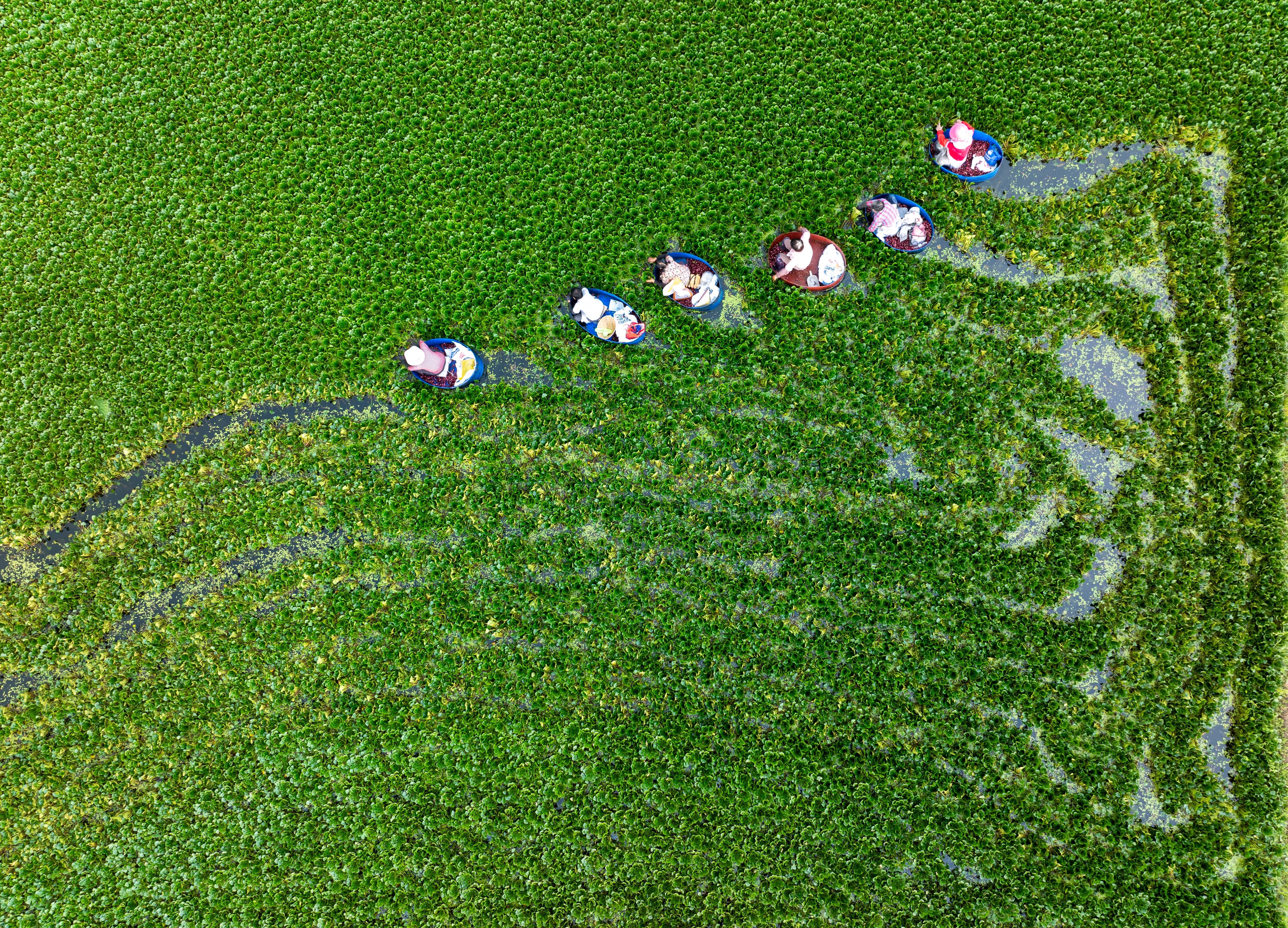 2024年8月7日,江蘇淮安市洪澤區(qū)岔河鎮(zhèn)的村民采收菱角。近年來(lái),當(dāng)?shù)乩冒遵R湖優(yōu)質(zhì)水域生態(tài)為依托,帶動(dòng)當(dāng)?shù)剞r(nóng)民增收致富,助力鄉(xiāng)村振興。