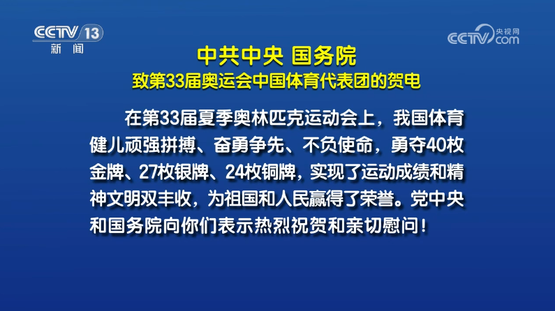 8月11日,中共中央、國(guó)務(wù)院向第33屆夏季奧運(yùn)會(huì)中國(guó)體育代表團(tuán)致賀電,高度評(píng)價(jià)我國(guó)體育健兒“實(shí)現(xiàn)了運(yùn)動(dòng)成績(jī)和精神文明雙豐收,為祖國(guó)和人民贏得了榮譽(yù)”。賀電指出,我國(guó)體育健兒們以優(yōu)異成績(jī)和出色表現(xiàn),進(jìn)一步激發(fā)了海內(nèi)外中華兒女的愛國(guó)熱情、振奮了民族精神、凝聚了奮進(jìn)力量。