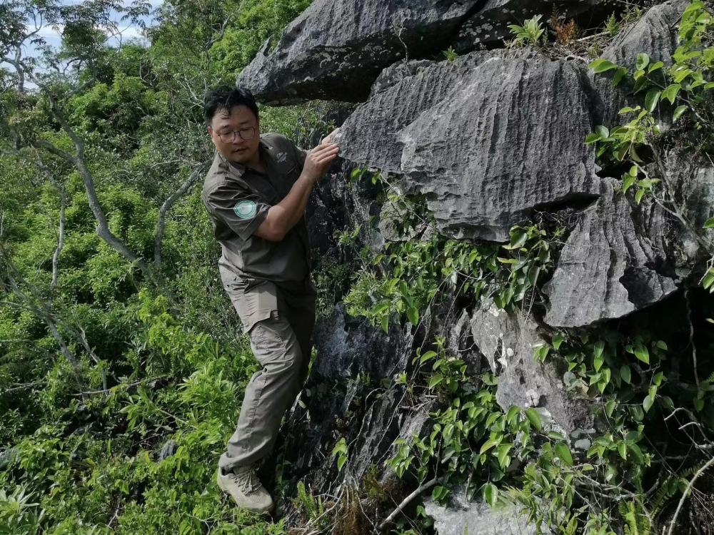 齊旭明在熱帶雨林中監(jiān)測(cè)海南長(zhǎng)臂猿活動(dòng)。(受訪者供圖)