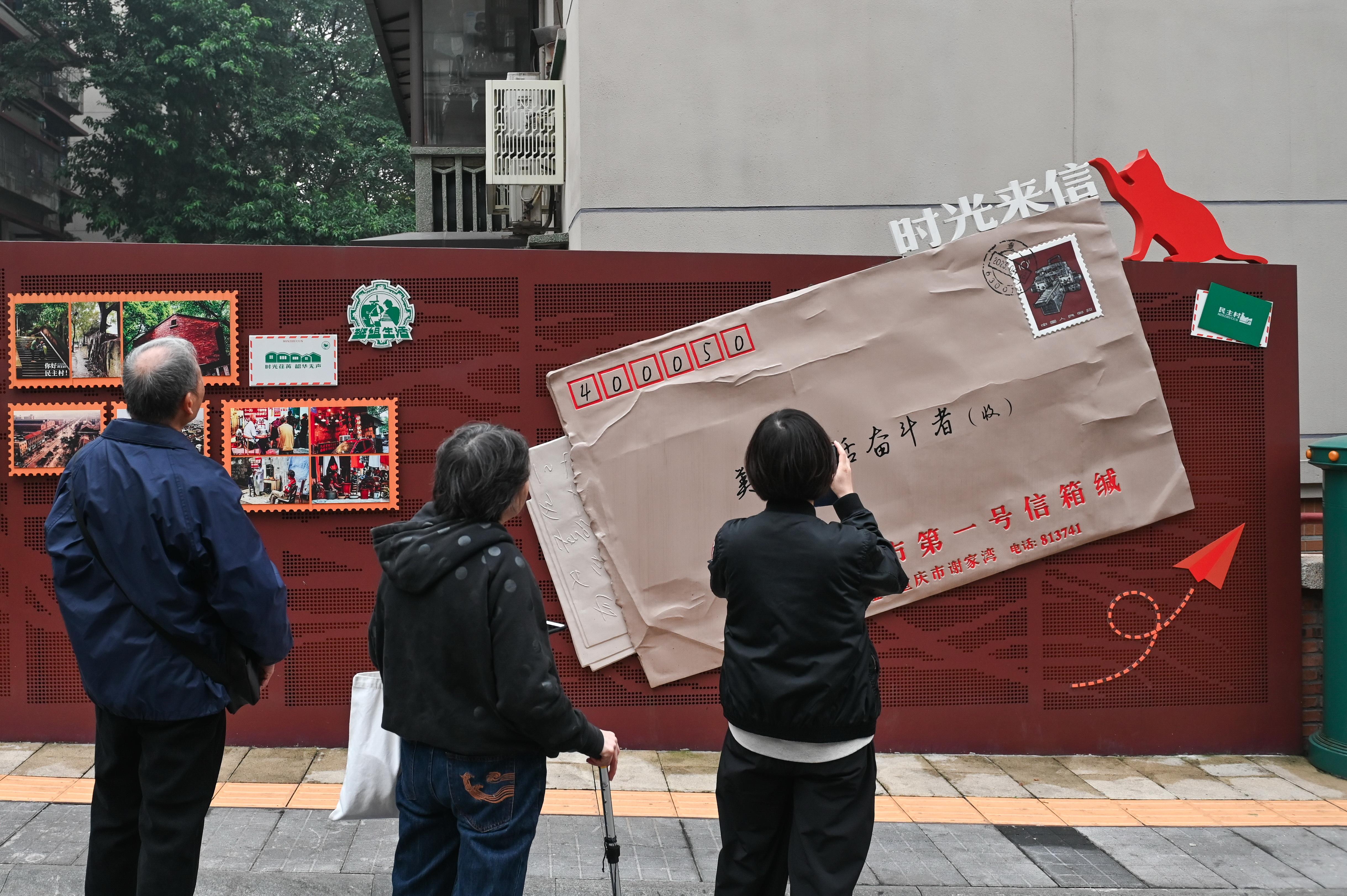 在重慶市九龍坡區(qū)民主村社區(qū),一封寄給“美好生活奮斗者”的巨大信封,幾乎鋪滿一面紅色的墻。市井煙火氣與新潮現(xiàn)代的時尚范兒融合交織,讓這里成為新晉網(wǎng)紅打卡地。