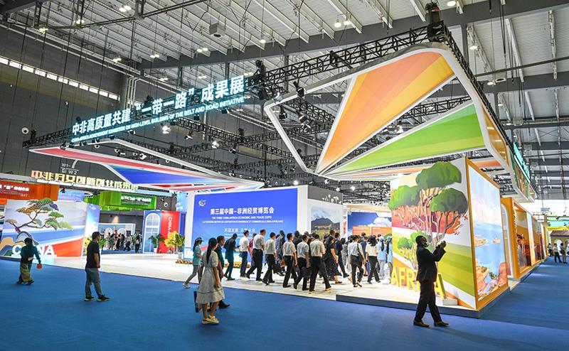 2023年6月29日,第三屆中國—非洲經(jīng)貿(mào)博覽會在湖南長沙開幕。圖為參會嘉賓在長沙國際會展中心參觀中非高質(zhì)量共建“一帶一路”成果展。