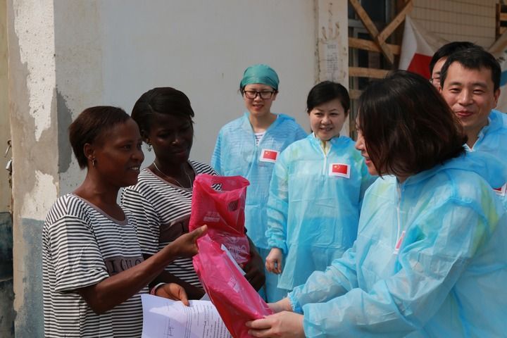 2015年4月4日,在位于塞拉利昂首都弗里敦市郊的中塞友好醫(yī)院埃博拉診療中心,中國(guó)第四批援塞醫(yī)療隊(duì)副隊(duì)長(zhǎng)邵蔚(右前)向被治愈的埃博拉出血熱患者贈(zèng)送禮物。新華社發(fā)(祖榮強(qiáng) 攝)