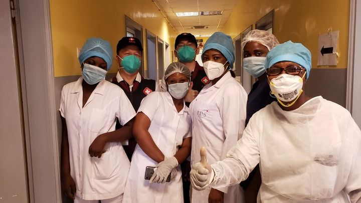 2020年5月26日,中國(guó)抗疫醫(yī)療專家組在剛果(布)首都布拉柴維爾指導(dǎo)新冠肺炎病房建設(shè)時(shí),與當(dāng)?shù)匾痪€醫(yī)務(wù)人員合影。新華社發(fā)