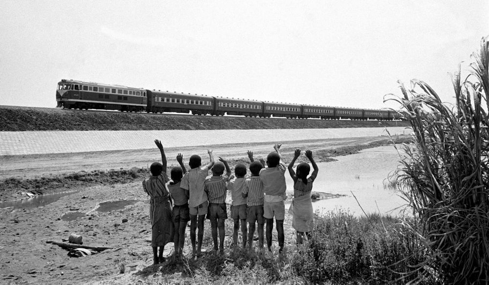 贊比亞魯西瓦西湖畔的少年兒童歡迎坦贊鐵路的列車(chē)通到他們的家鄉(xiāng)(1976年攝)。新華社發(fā)