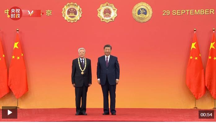 中華人民共和國(guó)國(guó)家勛章和國(guó)家榮譽(yù)稱(chēng)號(hào)頒授儀式9月29日上午10時(shí)在人民大會(huì)堂隆重舉行。中共中央總書(shū)記、國(guó)家主席、中央軍委主席習(xí)近平向“人民科學(xué)家”國(guó)家榮譽(yù)稱(chēng)號(hào)獲得者趙忠賢頒授獎(jiǎng)?wù)隆?/p>