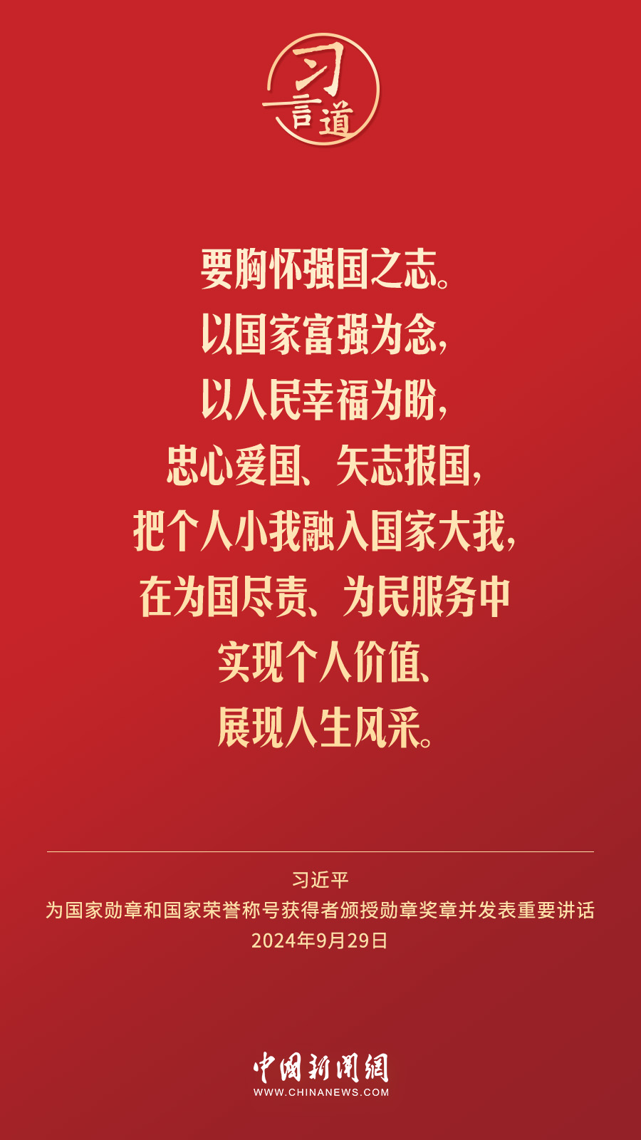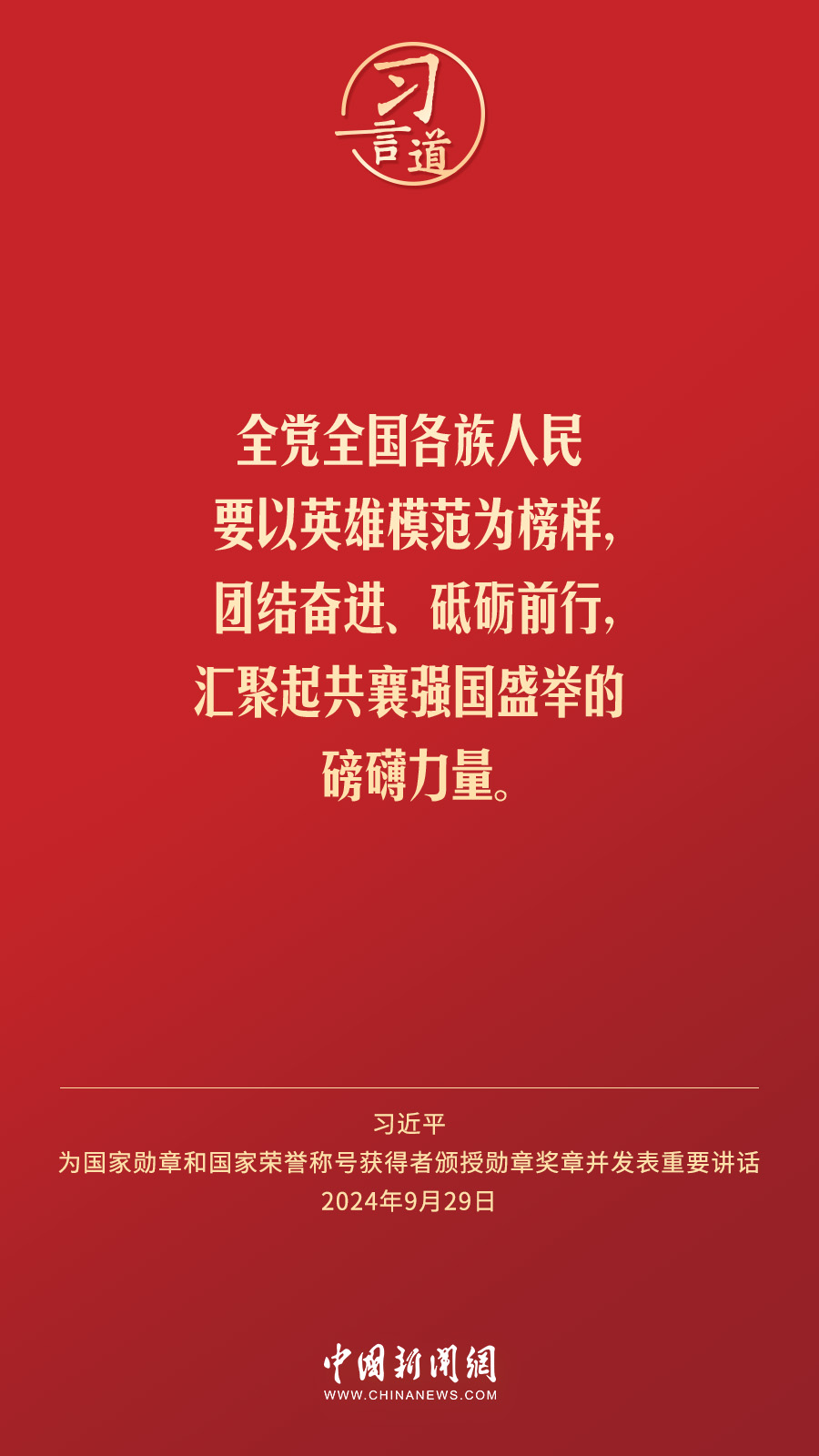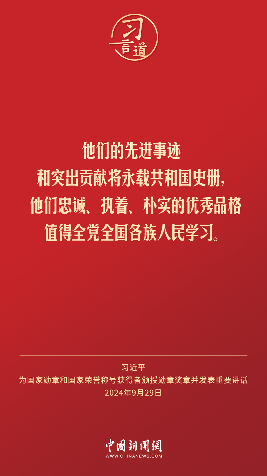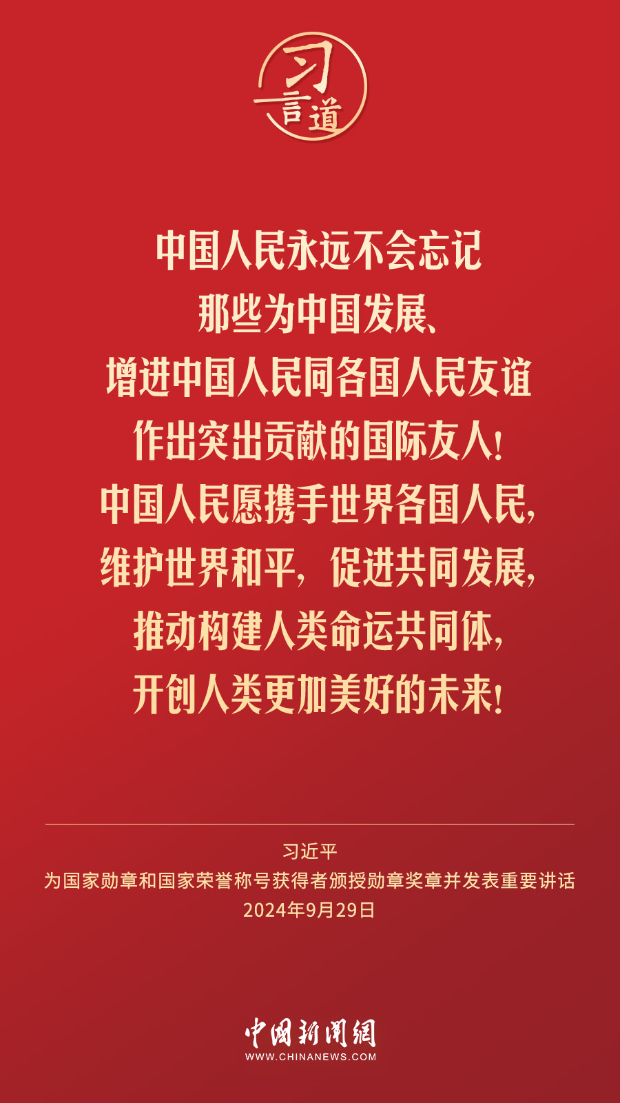 經(jīng)中共中央批準(zhǔn),中華人民共和國(guó)國(guó)家勛章和國(guó)家榮譽(yù)稱號(hào)頒授儀式于9月29日上午10時(shí)在人民大會(huì)堂隆重舉行。中共中央總書記、國(guó)家主席、中央軍委主席習(xí)近平向國(guó)家勛章和國(guó)家榮譽(yù)稱號(hào)獲得者分別授予“共和國(guó)勛章”“友誼勛章”和國(guó)家榮譽(yù)稱號(hào)獎(jiǎng)?wù)虏l(fā)表重要講話。習(xí)近平指出——