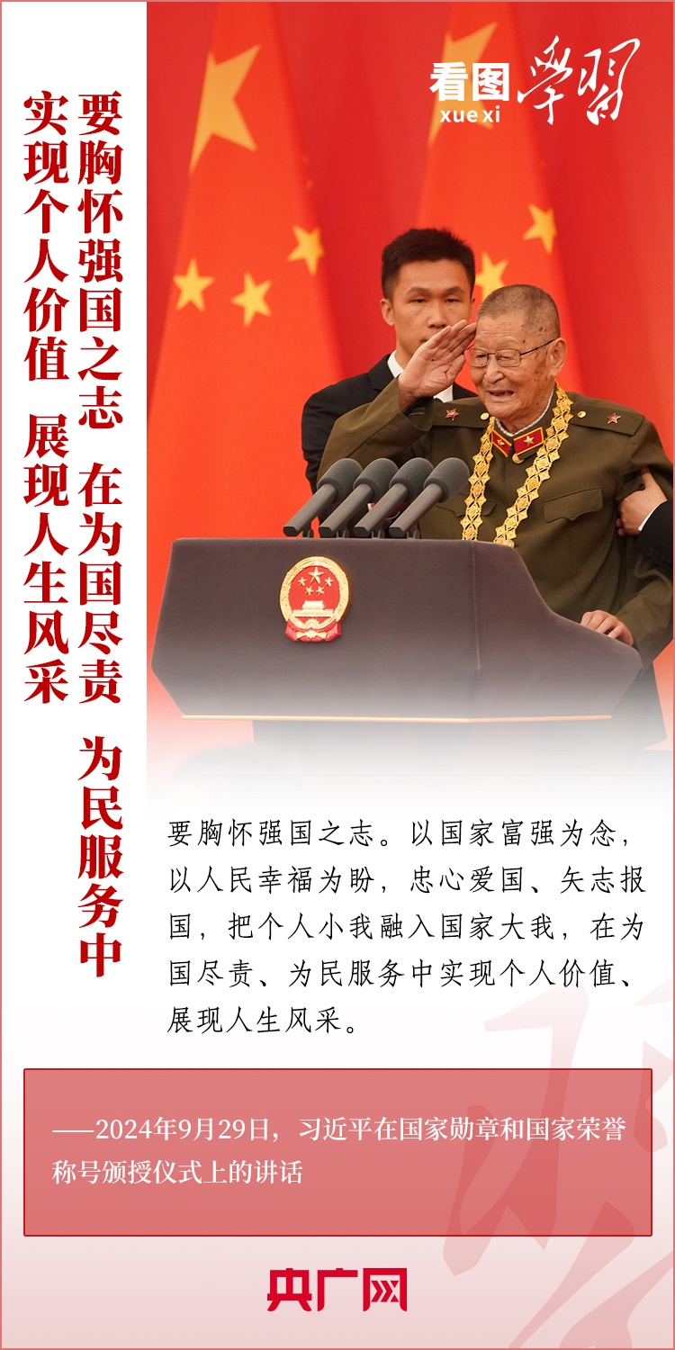 9月29日,中華人民共和國(guó)國(guó)家勛章和國(guó)家榮譽(yù)稱號(hào)頒授儀式在北京舉行,習(xí)近平總書記向國(guó)家勛章和國(guó)家榮譽(yù)稱號(hào)獲得者頒授勛章獎(jiǎng)?wù)虏l(fā)表重要講話??倳洀?qiáng)調(diào),全黨全國(guó)各族人民要以英雄模范為榜樣,團(tuán)結(jié)奮進(jìn)、砥礪前行,匯聚起共襄強(qiáng)國(guó)盛舉的磅礴力量。一起來學(xué)習(xí)!