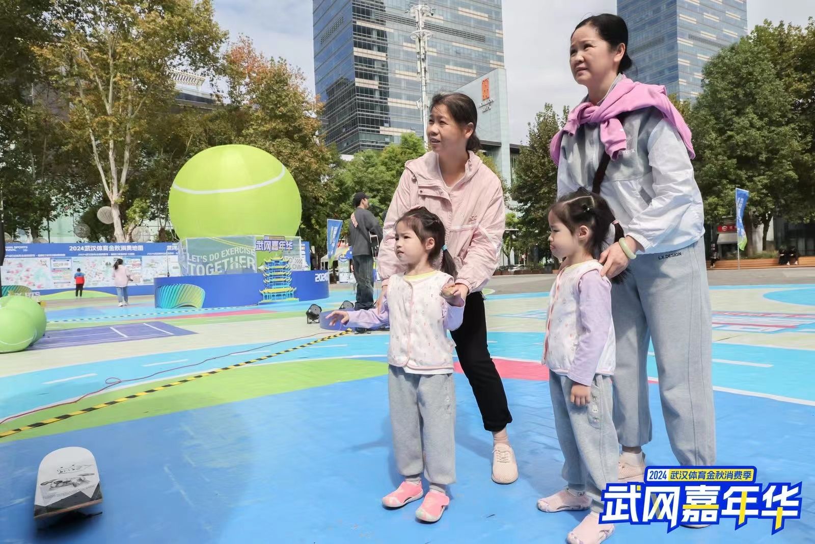 10月4日,武漢天地商圈熱鬧非凡,武漢體育金秋消費季——武網(wǎng)嘉年華分會場,琳瑯滿目的市集展銷,設(shè)置了網(wǎng)球、籃球、沖浪等多樣運動互動裝置,還有多個特色城市打卡點,吸引了市民游客前來體驗。游客樊女士介紹,專程帶孩子過來看比賽,平時也會打網(wǎng)球,在這里動一動熱熱身,很有意思。