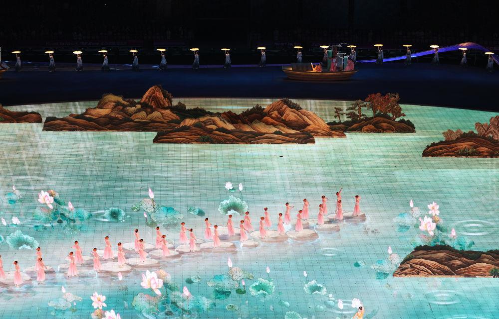 2023年9月23日,演員在杭州亞運(yùn)會(huì)開(kāi)幕式上表演。《千里江山圖》和《富春山居圖》兩幅國(guó)寶級(jí)名畫(huà),通過(guò)數(shù)字技術(shù),成為移動(dòng)的山水。