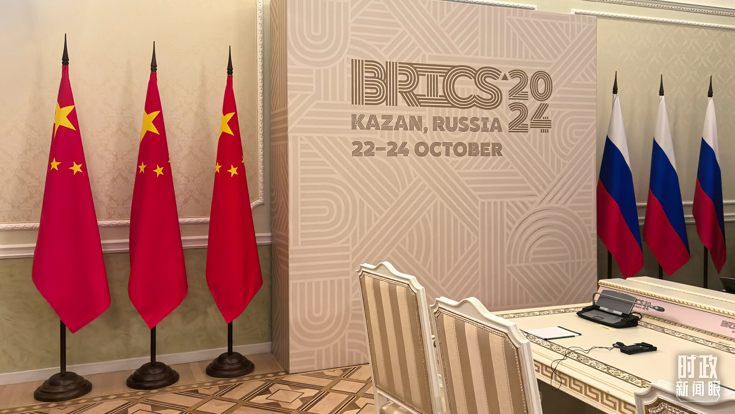 中俄兩國(guó)元首喀山會(huì)晤開(kāi)始前的現(xiàn)場(chǎng)。(總臺(tái)央視記者程鋮拍攝)