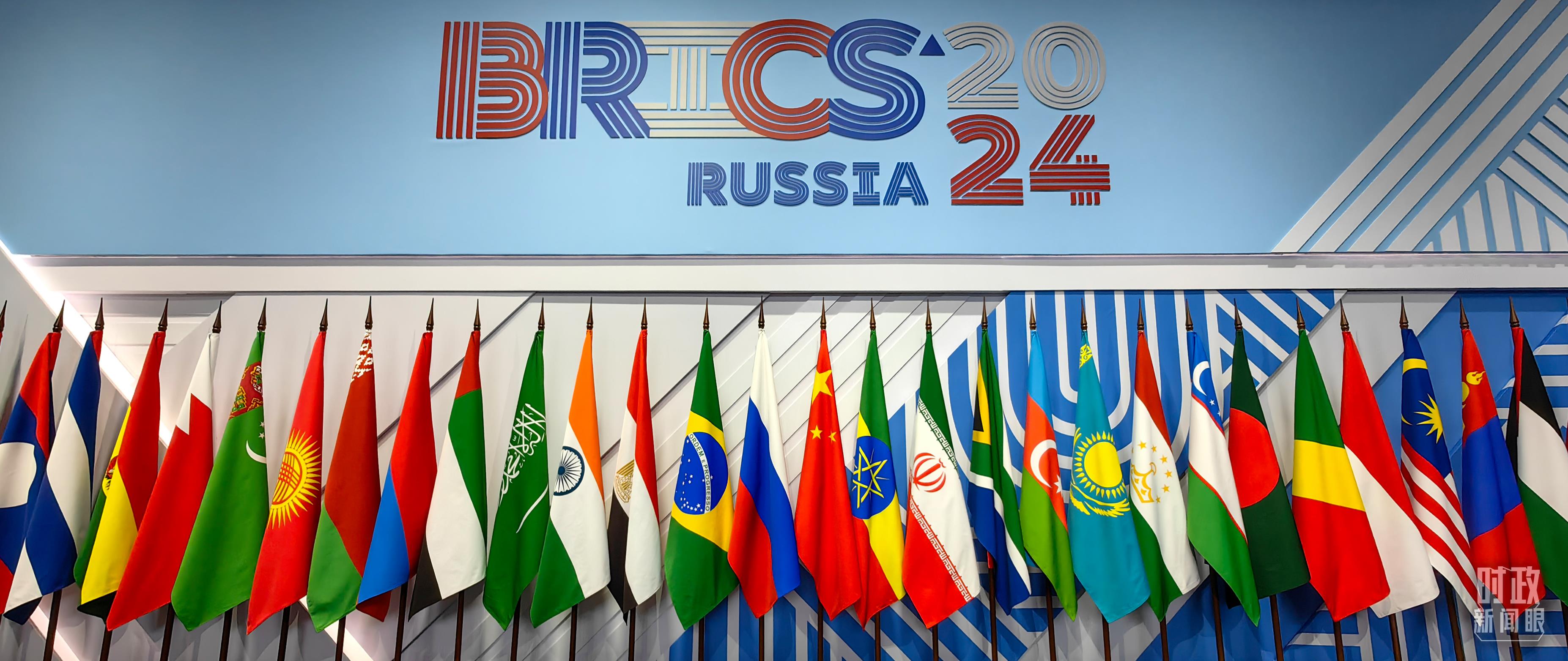 金磚國(guó)家領(lǐng)導(dǎo)人大范圍會(huì)議現(xiàn)場(chǎng)擺放的旗陣。(總臺(tái)央視記者段德文拍攝)
