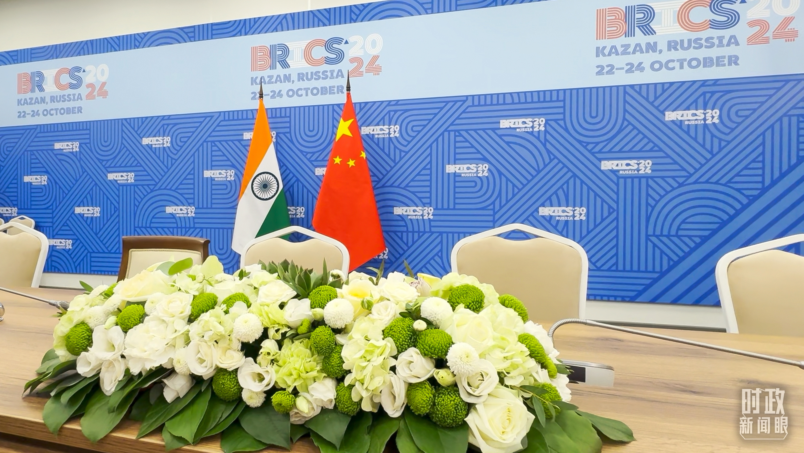 金磚國(guó)家領(lǐng)導(dǎo)人小范圍會(huì)議現(xiàn)場(chǎng)的會(huì)議桌。(總臺(tái)央視記者程鋮拍攝)