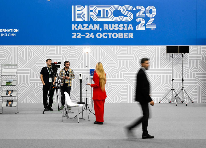 2024年10月23日,媒體工作人員在俄羅斯喀山金磚峰會(huì)新聞中心工作。新華社記者 申宏 攝