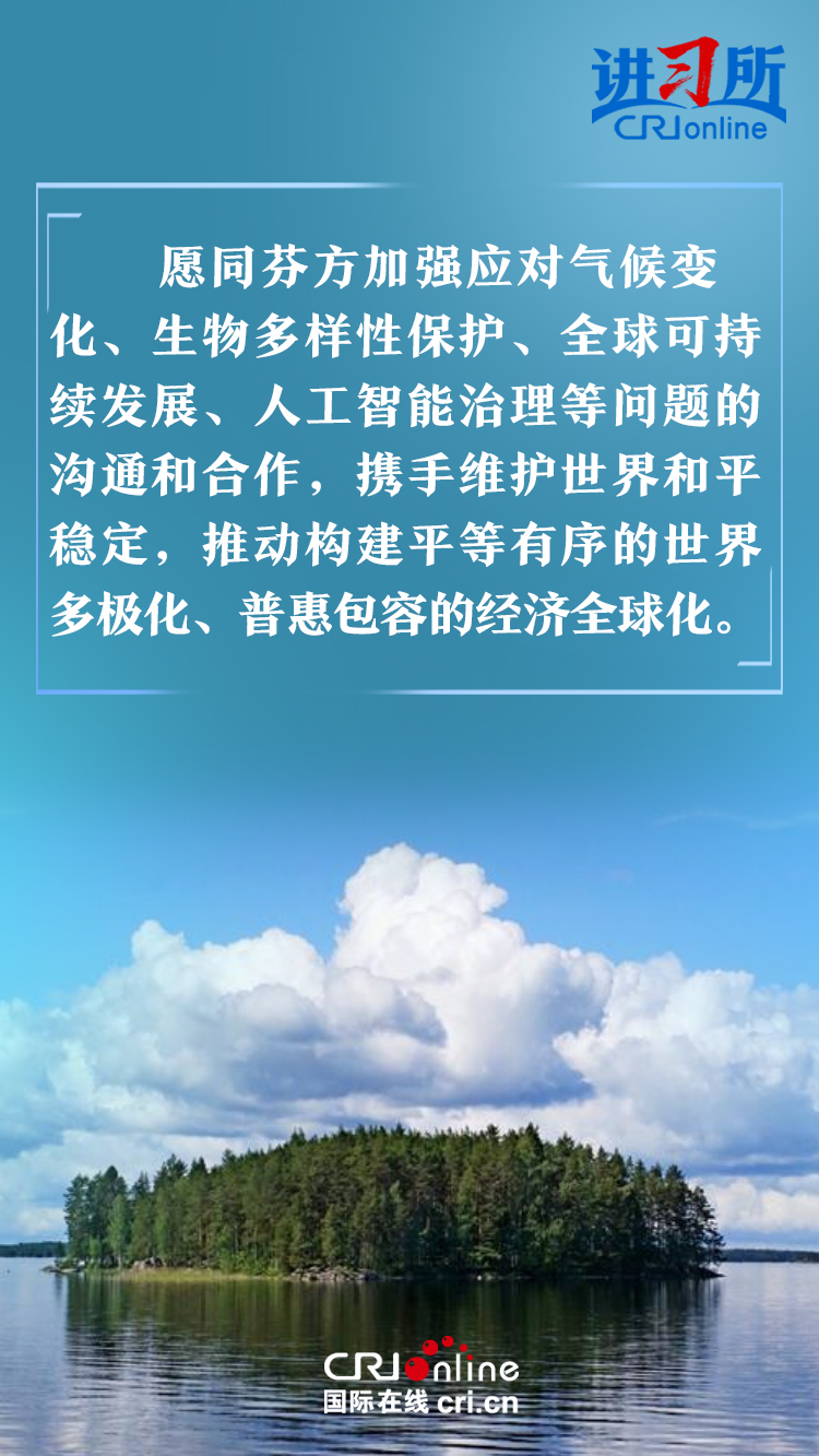 習(xí)近平指出,建交以來(lái),中芬始終友好相處、互尊互信,樹立了國(guó)與國(guó)之間超越歷史、文化、制度差異,平等交往的典范。中方愿同芬方一道,加強(qiáng)戰(zhàn)略合作,弘揚(yáng)友好傳統(tǒng),將中芬面向未來(lái)的新型合作伙伴關(guān)系進(jìn)一步推向前進(jìn),更好造福兩國(guó)和兩國(guó)人民,為世界和平和發(fā)展作出新貢獻(xiàn)。