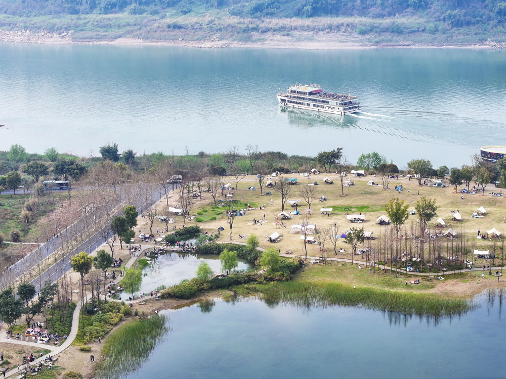2024年3月16日,游客在重慶廣陽島東島頭一帶游覽、休閑(無人機(jī)照片)。廣陽島是長江上游最大的江心島。近年來,當(dāng)?shù)叵到y(tǒng)推進(jìn)自然恢復(fù)、生態(tài)修復(fù),豐富生物多樣性。2024年,重慶廣陽島生態(tài)修復(fù)項(xiàng)目成功入選聯(lián)合國“生態(tài)恢復(fù)十年”優(yōu)秀案例。